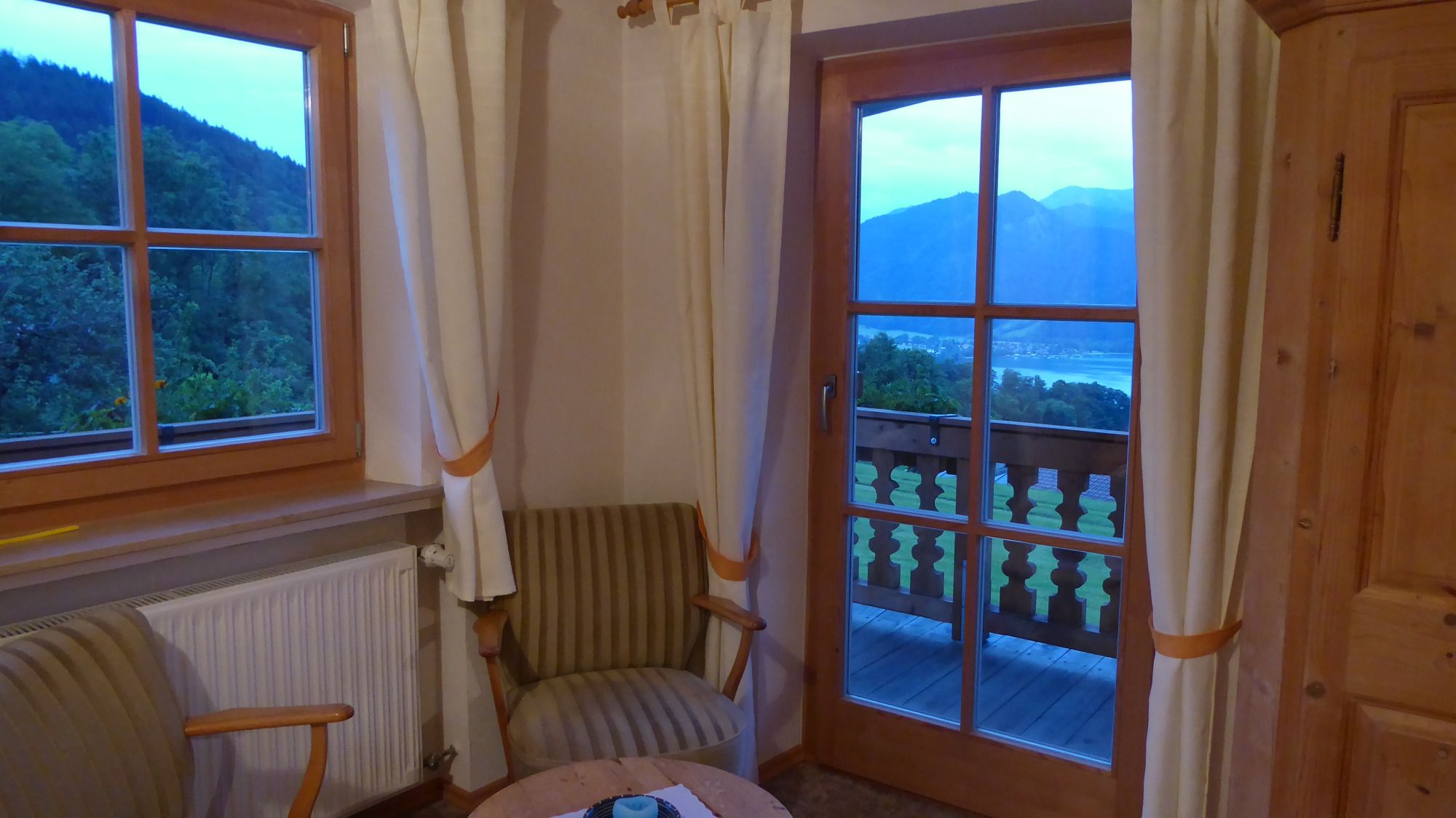 Auf dem dazugehörigen, eigenen Balkon lässt sich der direkte Blick auf den Tegernsee mit einem Glas Wein oder einer Flasche Bier genießen.